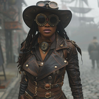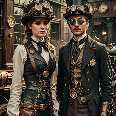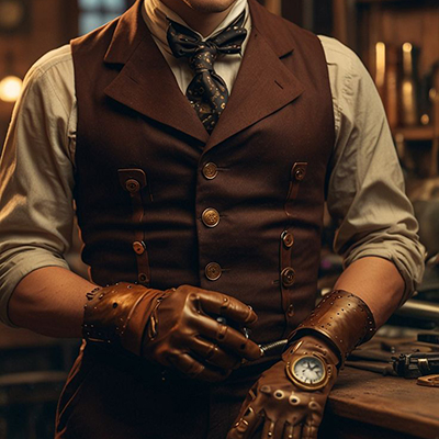 No Black Tie Full Steampunk Enfilez vos plus belles bottes d’aventurier, vos chemises aux tons beiges et une veste en cuir. Complétez votre look avec des accessoires cuivrés et dorés: montres à gousset et et des gants de cuir. N’oubliez pas les chapeaux haut-de-forme rehaussés de plumes ou de lunettes d’aviateur. Entrez dans l’univers steampunk avec élégance et audace !
